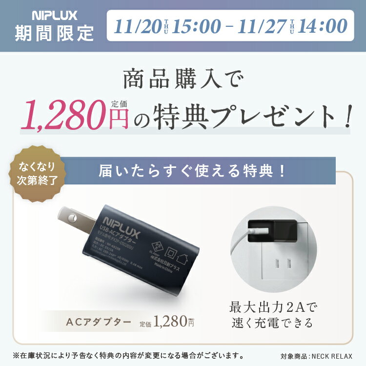 --------------------------------------------------- ◆2022年販売実績:23,000台 (集計日1月1日〜5月26日) ◆2021年販売実績:35515台 (集計日1月1日〜12月31日) ◆楽天市場★週間ランキング【1位】獲得! リラックス・マッサージ用品 > 簡易マッサージグッズ部門 ※更新日:2022年5月11日(水) (集計日5月2日〜5月8日) ◆楽天市場★週間ランキング【1位】獲得! リラックス・マッサージ用品 > 簡易マッサージグッズ部門 ※更新日:2021年6月23日(水) (集計日6月14日〜6月20日) ◆楽天市場★総合ランキング【1位】獲得! リアルタイムランキング部門 ※更新日:2020年11月24日(火) 01時17分 --------------------------------------------------- ■ 商品仕様 ブランド NIPLUX(ニップラックス) 商品名 NIPLUX NECK RELAX(ニップラックス ネックリラックス) 定格電圧 DC 5V 2A 消費電力 約4W(充電時) 電池容量 700mAh 電源供給元 ACアダプター セット内容 本体×1台 充電用USBコード×1本 取扱説明書×1部 本体寸法 約149×143×36(mm) パッケージ箱寸法 約170×170×50(mm) 本体重量 約145g 使用環境 温度 5℃~40℃/相対湿度≦80%RH 保証期間 1年 使用前の確認 ※本製品は、医療機器/ 治療器 / マッサージ機 / マッサージ器 / マッサージャー / ネックマッサージャー /マッサージ/マッサージチェア/ネックマッサージャー/マッサージオイル/マッサージクッション/ 電動マッサージ器ではありません。